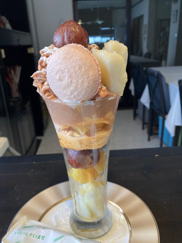 202510/26 モンブランパフェを10月26日よりご提供させて頂きます。(5食限定) 未分類 モ モンブランパフェ 税込 1,600円 マロンクリーム、自家製プリン、ミルクアイス、スフレパンケーキ、洋ナシ、熊本産栗の渋川煮、甘露煮、マカロン生地